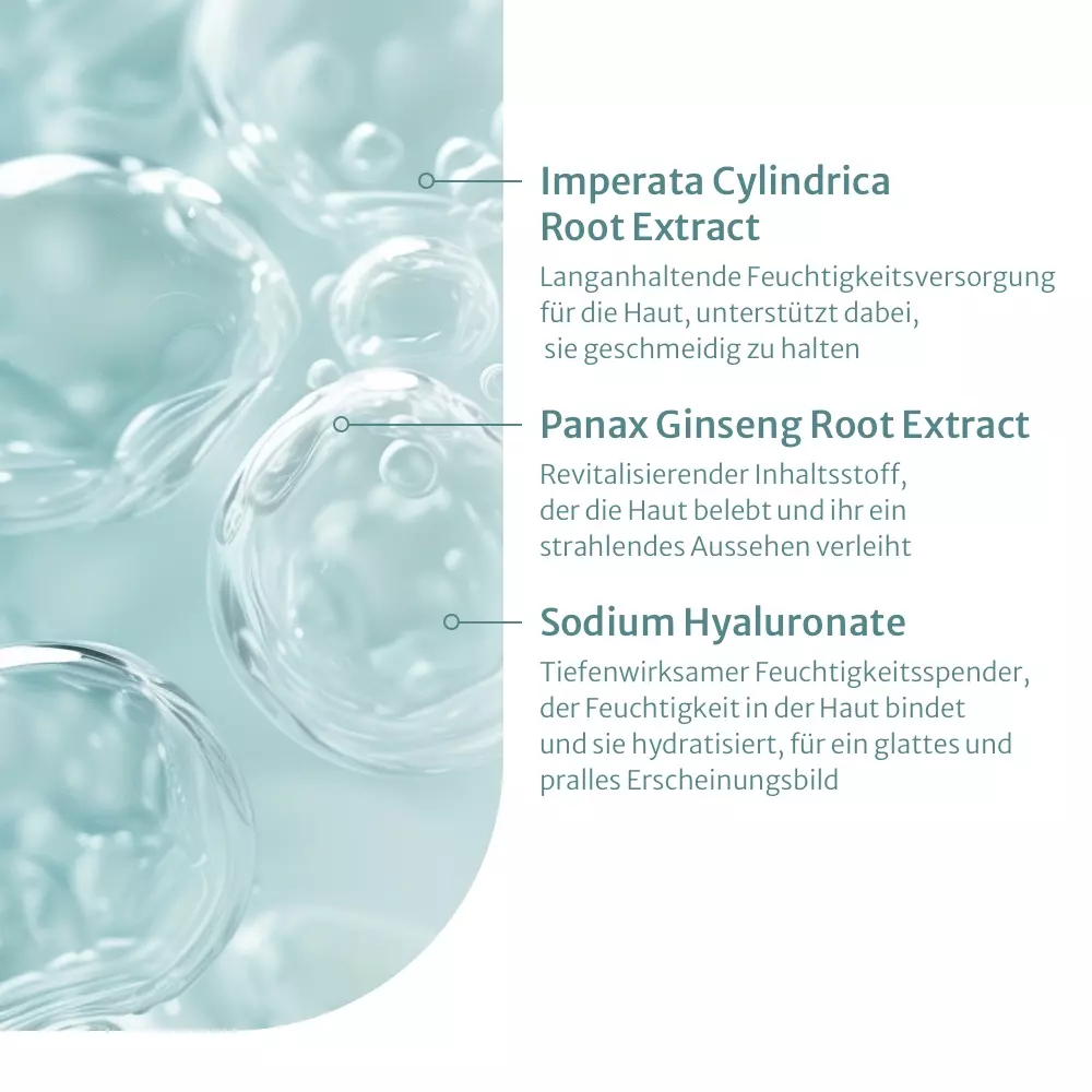 Diese vitalisierende Maske soll die Haut beleben, ihre Mikrozirkulation anregen und sie rosiger sowie aktiver aussehen lassen. Die enthaltene Hyaluronsäure spendet intensive Feuchtigkeit, während Coffein die Haut erfrischt und zum Strahlen bringt. Ein wertvoller Wirkstoffkomplex aus Lupinenproteinen, Spirulina, Rosmarinextrakt und Ananasextrakt wird für seine antioxidativen und hautschützenden Eigenschaften geschätzt. Der Wurzelextrakt der Imperata cylindrica kann einen Sofort-Lifting-Effekt mit Langzeitwirkung erzielen, während Ginseng-Extrakt revitalisierend, anregend und stärkend wirken soll.
