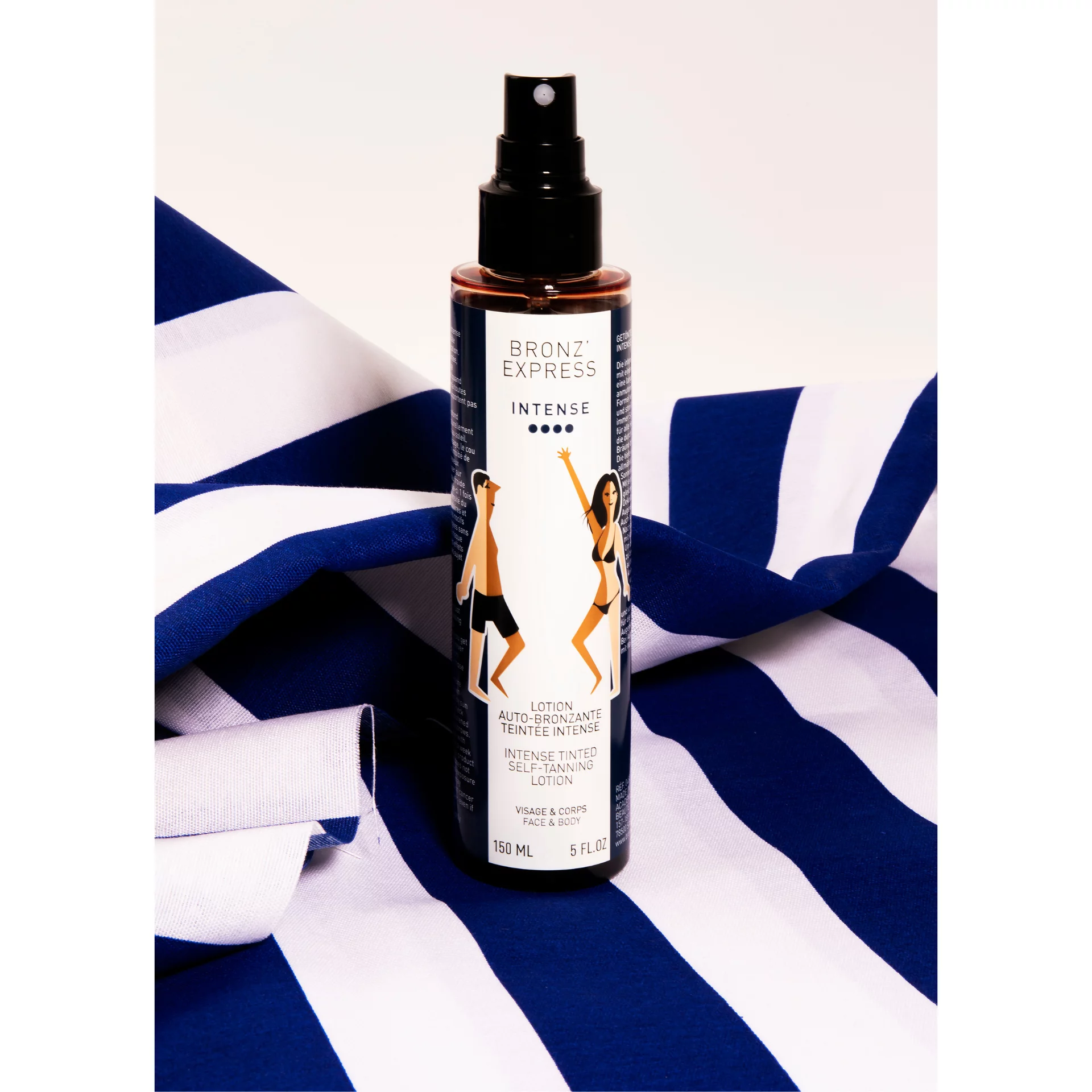 Mit der Bronz'Express Intense Getönten Selbstbräunungslotion genießen Sie eine intensive, langanhaltende Bräune – ganz ohne Sonne! Seit 65 Jahren steht Bronz'Express für streifenfreie, natürliche Bräune – jetzt feiert die Marke ihr Jubiläum mit einem neuen Retro-Design! Das hautfreundliche "Bräunungswasser" sorgt schon nach einer Anwendung für eine natürliche, strahlende Tönung und hinterlässt weder Streifen noch Flecken. Dank der Sprühkopfflasche lässt sich die Lotion besonders gleichmäßig und hygienisch auftragen. Die Lotion ist wisch- und wasserfest und verleiht Gesicht und Körper innerhalb weniger Stunden eine sonnengeküsste Haut. Ideal für alle Hauttypen, auch für Haut, die schlecht auf Sonnenbräune anspricht.