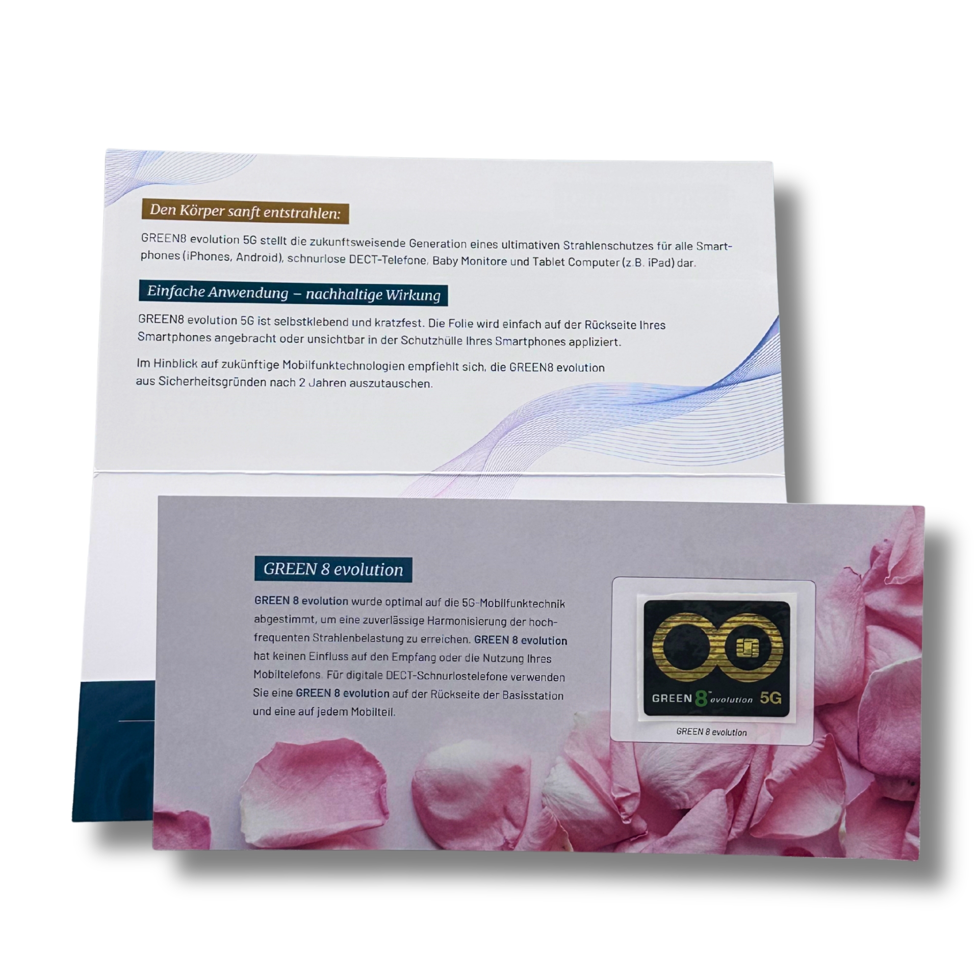 Die Folie wird auf der Rückseite vom Handy, schnurlose DECT-Telefone, iPad oder an der Hülle befestigt. Bei DECT-Telefonen wird je eine GREEN 8 evolution 5G an der Station und am Mobilteil fixiert.
