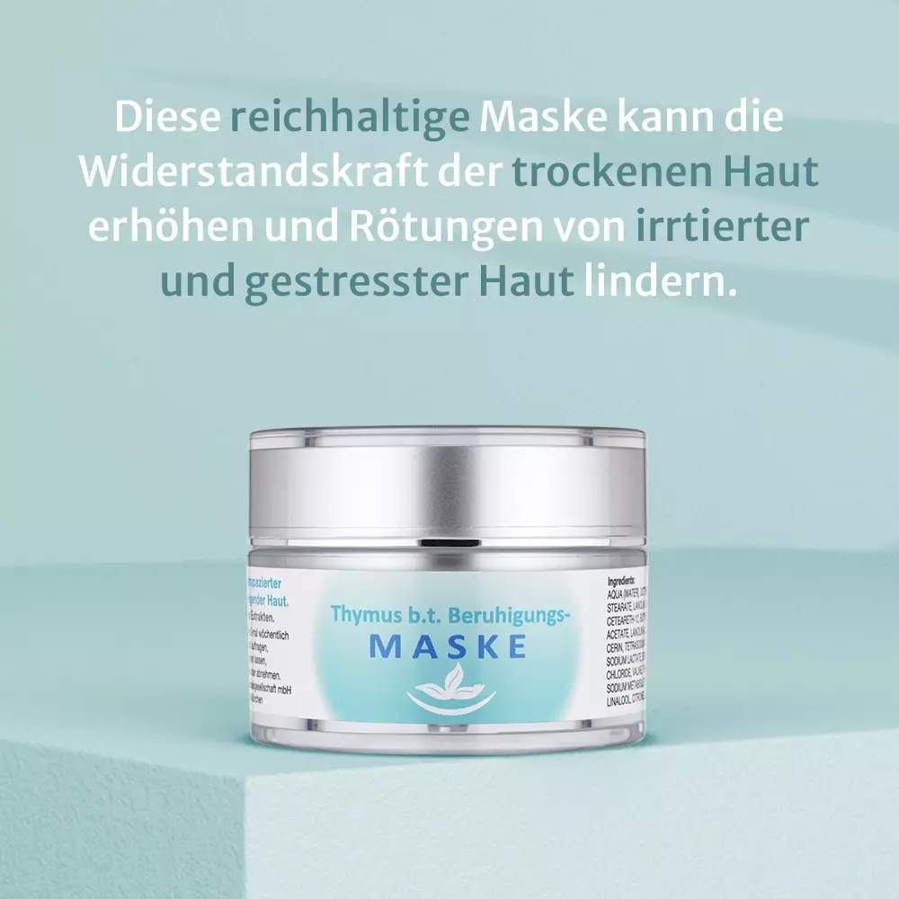Sanfte Beruhigung & Pflege mit Thymus-Extrakt Diese reichhaltige Maske kann die Widerstandskraft trockener Haut stärken und ihre Empfindlichkeit reduzieren. Sie wirkt harmonisierend und ausgleichend, während sie strapazierte, zu Rötungen und Allergien neigende Haut beruhigt. Wertvolle Inhaltsstoffe wie Sheabutter, Panthenol und Glycoproteine pflegen intensiv und hinterlassen ein entspanntes, geschmeidiges Hautgefühl. ✔ Beruhigt empfindliche & gereizte Haut ✔ Wirkt harmonisierend & ausgleichend ✔ Stärkt die Widerstandskraft trockener Haut ✔ Pflegt intensiv mit Sheabutter & Panthenol ✔ Für ein entspanntes, geschmeidiges Hautgefühl Sheabutter – Feuchtigkeit & Schutz Versorgt die Haut mit wertvollen Lipiden und schützt vor Feuchtigkeitsverlust. Panthenol – Beruhigung & Pflege Spendet Feuchtigkeit und fördert die Regeneration der Haut. Glycoproteine – Stärkung der Hautbarriere Unterstützen die natürliche Schutzfunktion der Haut und helfen, sie widerstandsfähiger zu machen.