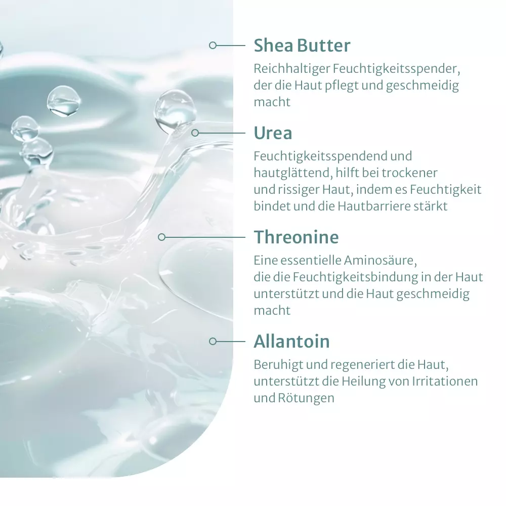Aqua (Wasser), Octyldodecanol, Myristyl Alcohol, Glyceryl Stearate, PEG-30 Stearate, Lanolin, Sorbitol, Isopropyl Stearate, Oleyl Erucate, Cetyl Alcohol, Ceteareth-12, Butyrospermum Parkii (Shea) Butter, Panthenol, Tocopheryl Acetate (Vitamin E), Lanolin Alcohol, Parfum (Duftstoff), Sodium Carbomer, Ethylhexylglycerin, Tetrasodium Glutamate Diacetate, Pentylene Glycol, Glycerin, Lactic Acid (Milchsäure), Sodium Lactate, Serine, Urea, Glycoproteins, Glutamic Acid, Citric Acid, Sodium Chloride, Valine, Threonine, Sodium Hydroxide, Allantoin, BHT, Phenoxyethanol, Sodium Metabisulfite, Cinnamyl Alcohol, Citral, Benzyl Salicylate, Coumarin, Linalool, Citronellol, Hexyl Cinnamal, Limonene, Alpha-Isomethyl Ionone