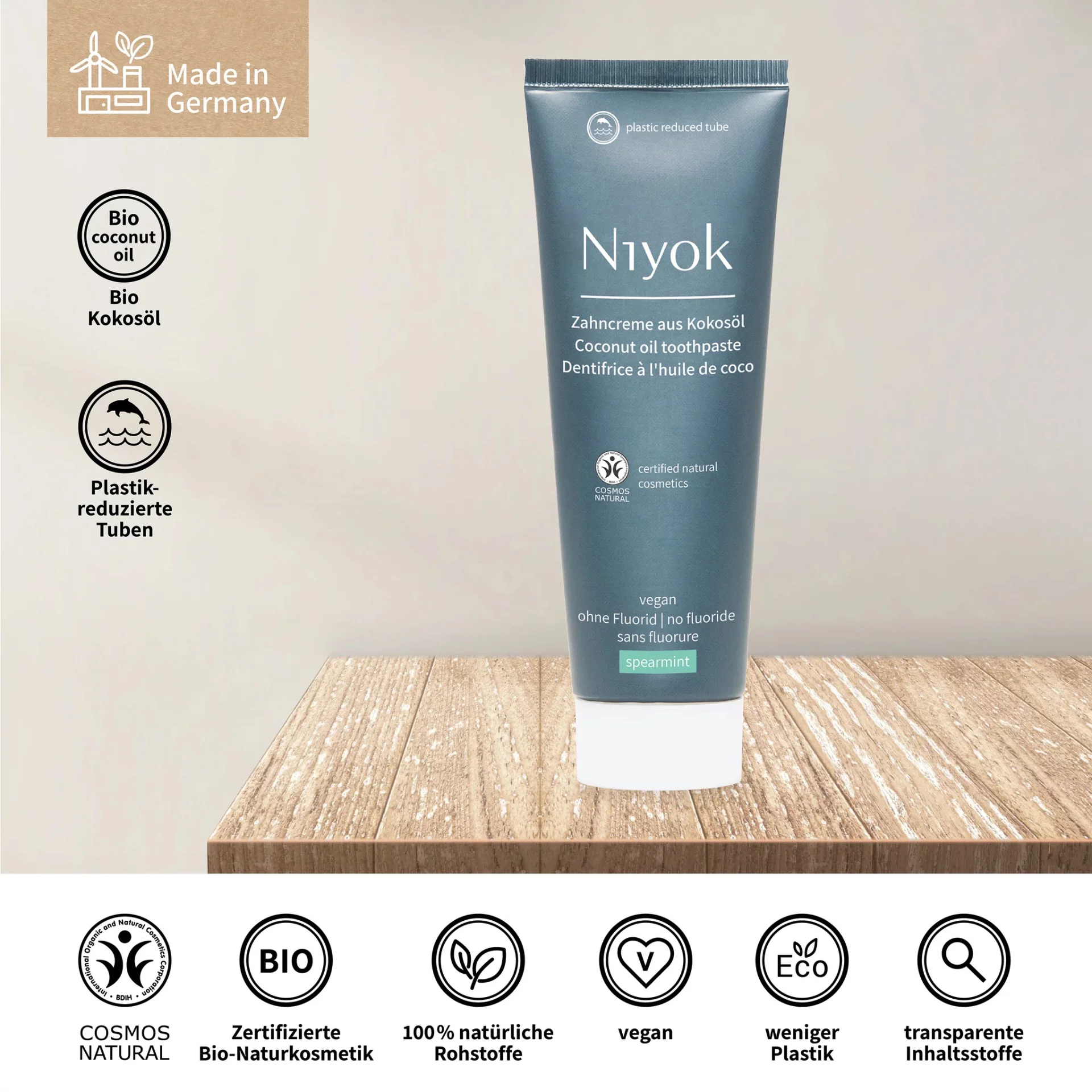 Die vegane Zahncreme Spearmint von Niyok vereint zertifizierte Naturkosmetik mit nachhaltigem Design. Sie basiert auf pflegendem Bio-Kokosöl und verzichtet komplett auf bedenkliche Inhaltsstoffe wie Fluorid, Parabene, Mikroplastik oder Palmöl. Stattdessen reinigt sie mit milden Kreide-Abrasivstoffen besonders schonend und ist ideal für empfindliche Zähne und Zahnfleisch geeignet. Der frische Spearmint-Geschmack erinnert an klassischen Kaugummi und sorgt für langanhaltend frischen Atem – ganz ohne Kokosgeschmack.